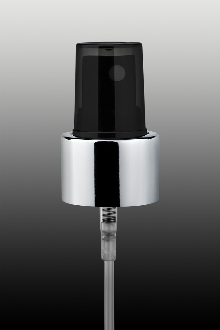 Atomizer o gwincie 24/410, długość rurki 180mm, z kołnierzem srebrnym połysk, czarna główka, czarna transparentna nasadka