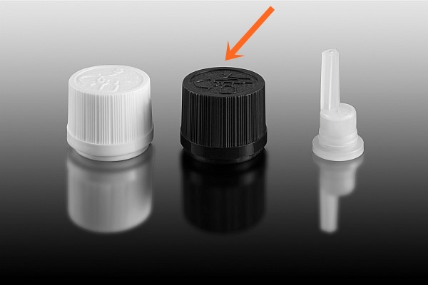 Nakrętka bezpieczna z pierścieniem gwarancyjnym 18/410, z kroplomierzem, czarna, PE