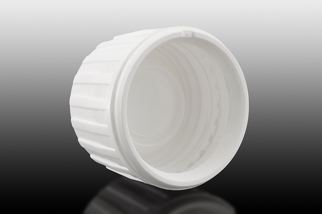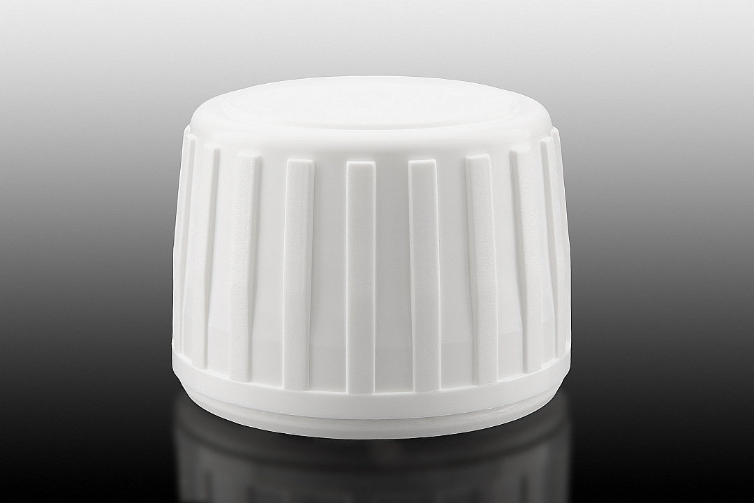 Nakrętka LDPE z kontrolą pierwszego otwarcia o gwincie 28/410, z wkładką/zatyczką, ryflowana