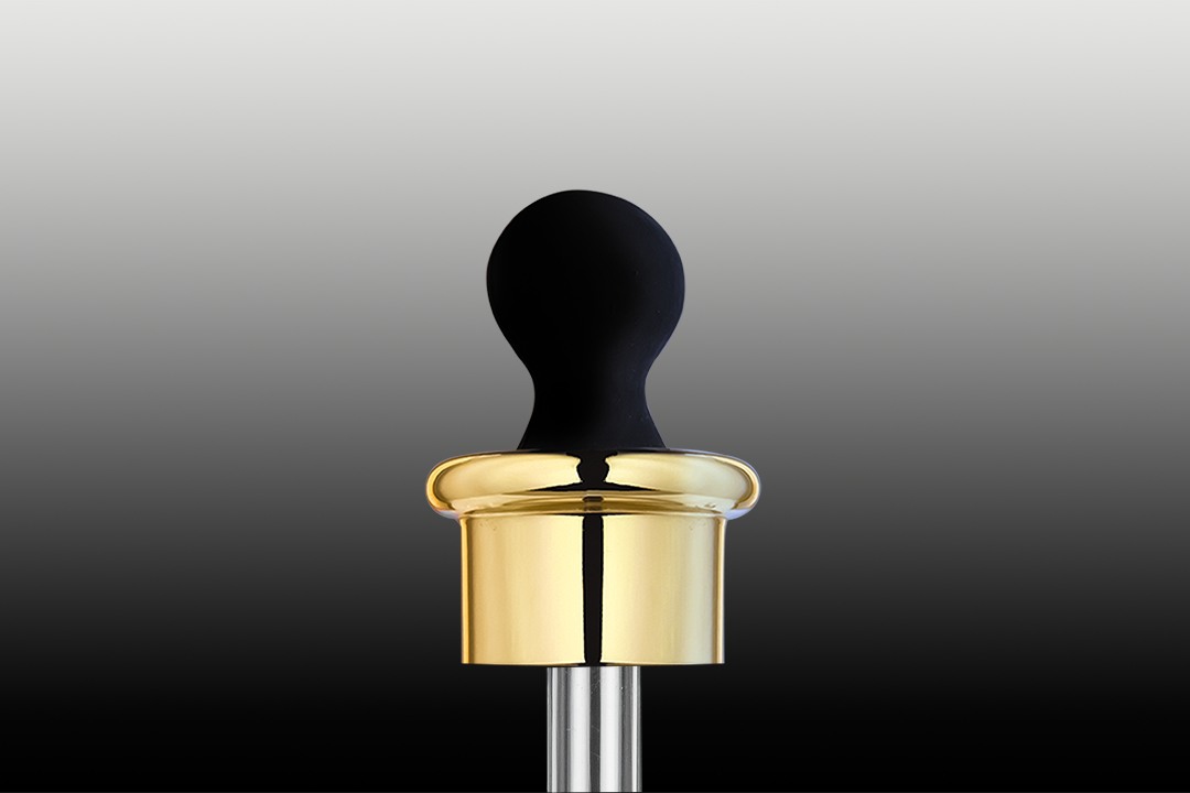 Zakraplacz z pipetą szklaną 47 mm, nakrętka złoty połysk, gruszka czarna matowa, PP/Alu