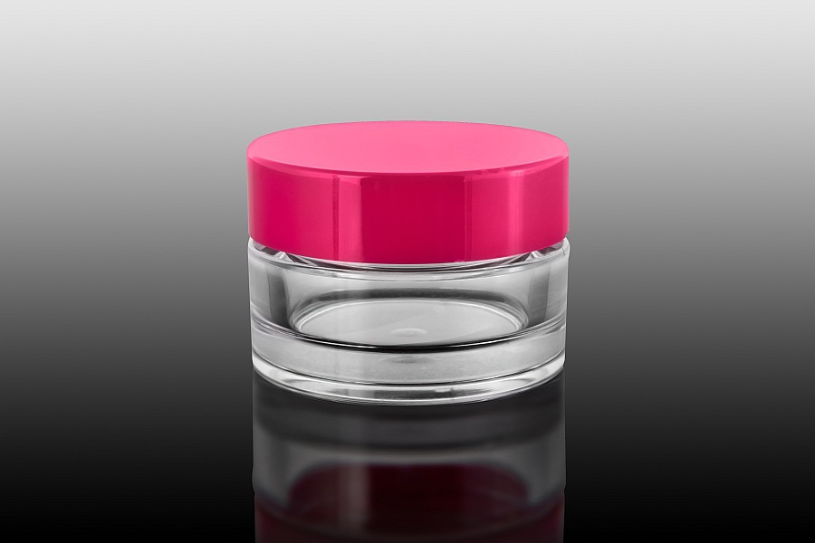Okrągły słoik 15 ml, transparentny z różową nakrętką, SAN i ABS