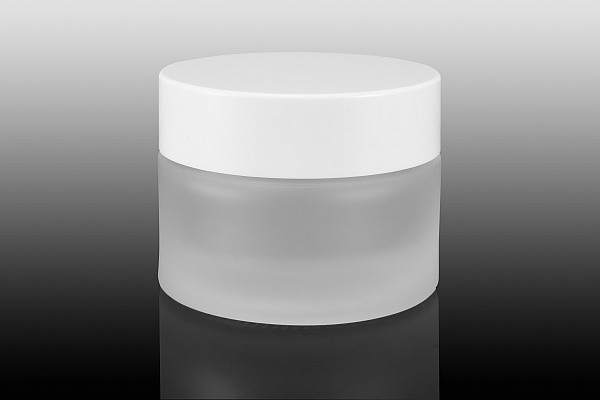 Okrągły słoik 50 ml, frostowany bezbarwny, nakrętka biała, szkło i ABS