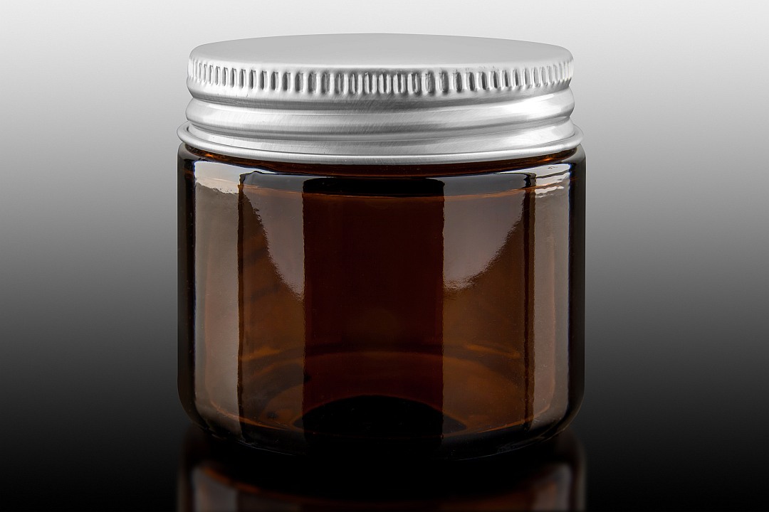Słoik okrągły, szklany 50 ml, transparentny brązowy, nakretka aluminium, szkło i PP